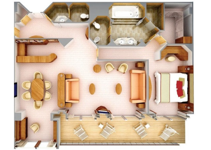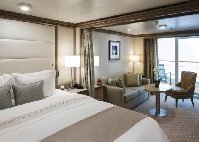 | R1 - Royal Suite 1 92 m² (vrátane balkóna 12 m²), Spálňa s obývacou a jedálenskou časťou. 7. paluba vpredu. Max 3 osoby. | 70 800 € 35 400 € za osobu | ||