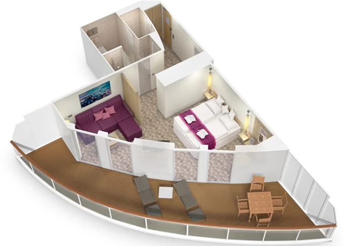 JA - Junior Suite s balkónom PREMIUM 34 m² + terasa 27,5 m². 8. až 15. paluba. Max 4 osoby. Cenový model Premium + výhody Junior Suite. 4 650 € 2 325 € za osobu